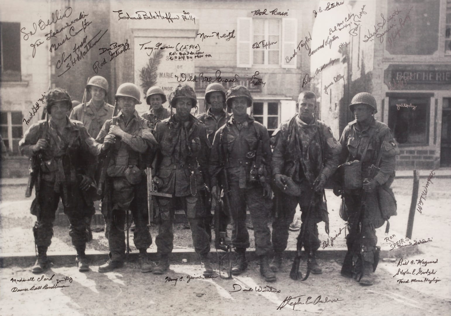 Quelques parachutistes de la « Easy Company » posent devant le socle du monument dédié à la Grande Guerre 1914-1918. La statue du « Poilu » a été retirée et cachée juste avant l’arrivée des allemands en juin 1940. Elle sera remise en place avec l’aide d’une unité du Génie de l’armée américaine pour la cérémonie nationale du 14 juillet 1944.