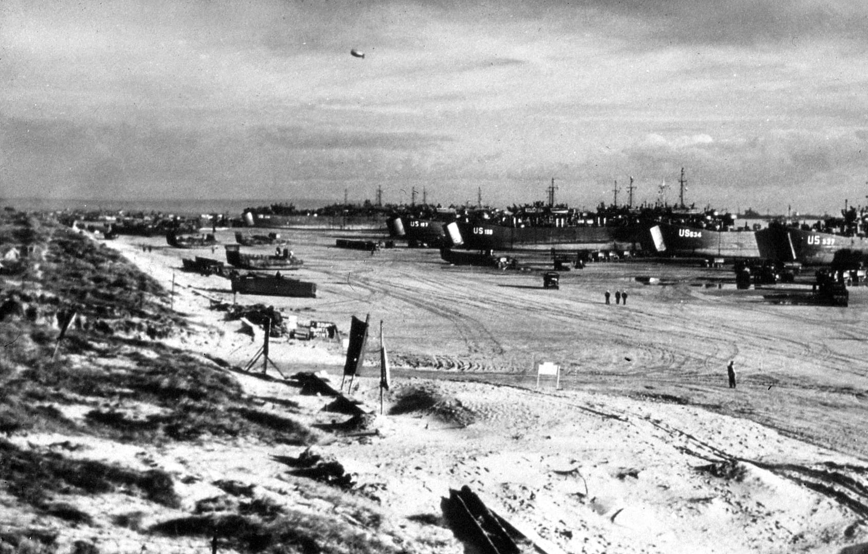 Été 1944. Les LST, navires spéciaux de 100 mètres de longueur à fond plat, conçus pour traverser les océans et venir s’échouer directement sur une plage sans infrastructure portuaire, sont venus s’aligner côte à côte avant que la marée ne se retire. Cette scène est située en face de la brèche d’accès à la route n° 3.