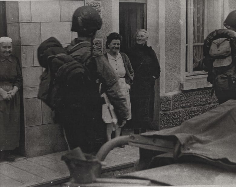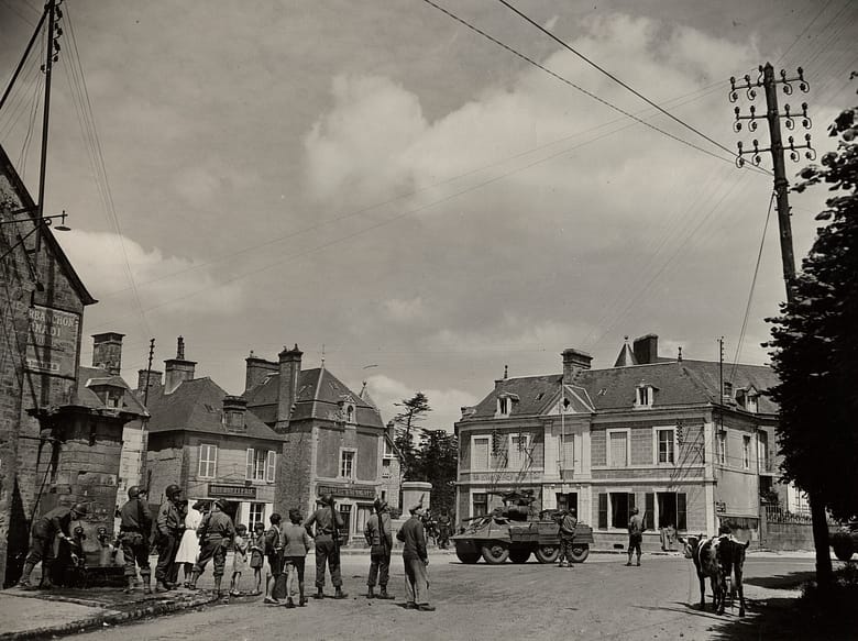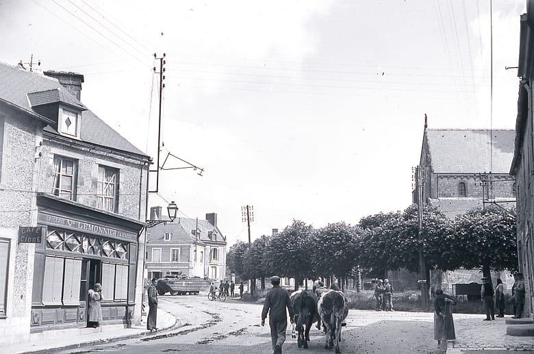 À Sainte-Marie-du-Mont, sous le soleil de l’été 1944, les habitants assistent avec curiosité à l’arrivée massive des troupes américaines. Tandis que la guerre a laissé des traces visibles dans le village, comme les impacts de balles, la vie reprend peu à peu. Les civils découvrent avec étonnement la modernité des véhicules et le langage des soldats libérateurs. Le 10 juin, une colonne de la 9ᵉ division d’infanterie passe par le village en route vers le front, dans l’objectif stratégique d’isoler Cherbourg.