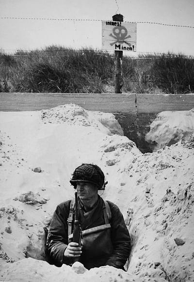 A soldier from the 4th Infantry Division stands guard in his foxhole dug at the foot of the anti-tank wall.