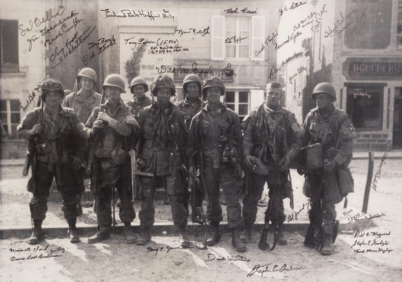 Some Easy Company paratroopers pose in front of the base of the monument dedicated to the Great War of 1914-1918. The “Poilu” statue was removed and hidden just before the arrival of the Germans in June 1940. With the help of a US Army engineering unit, it was put back in place for the national ceremony on July 14, 1944.