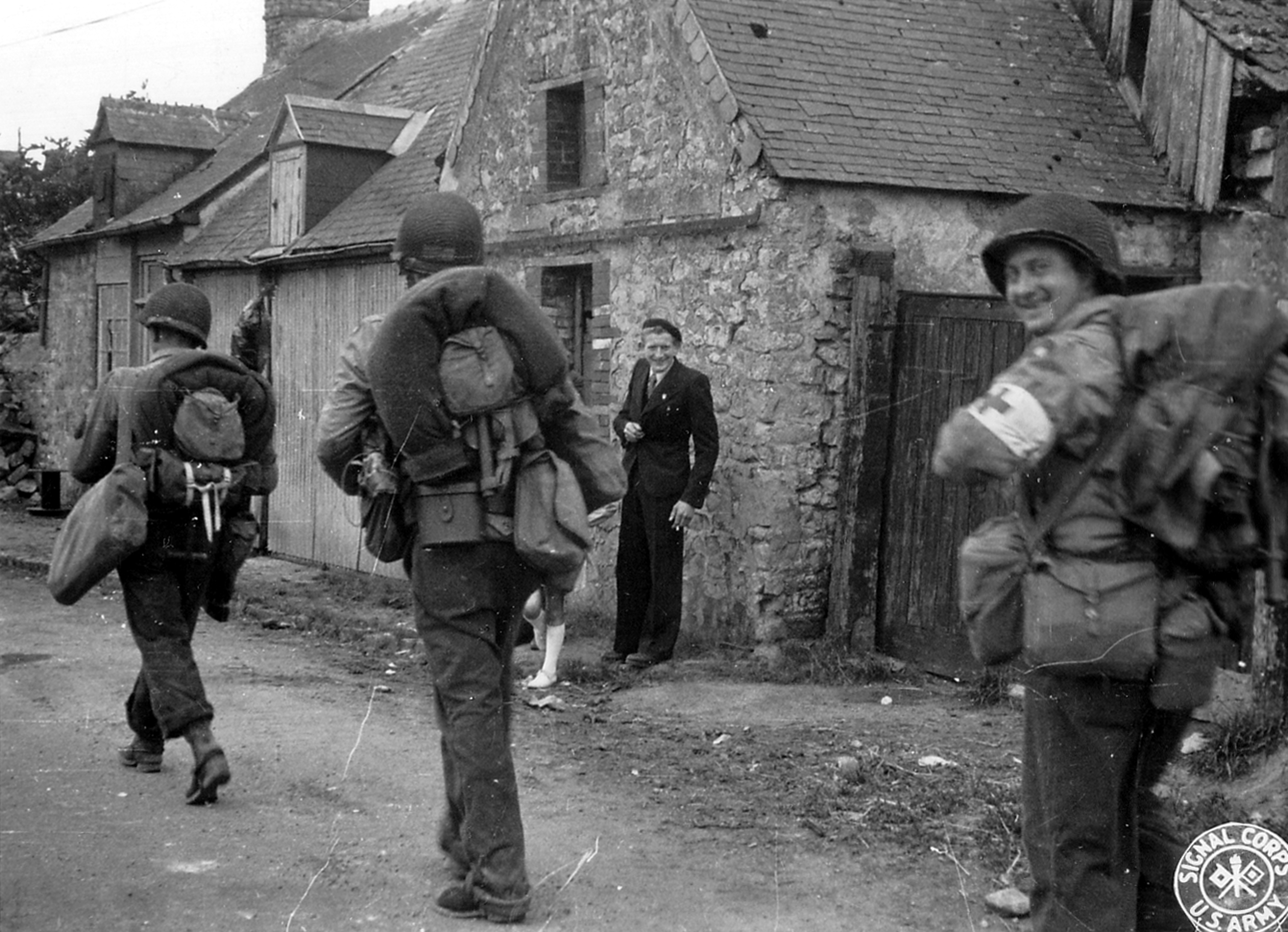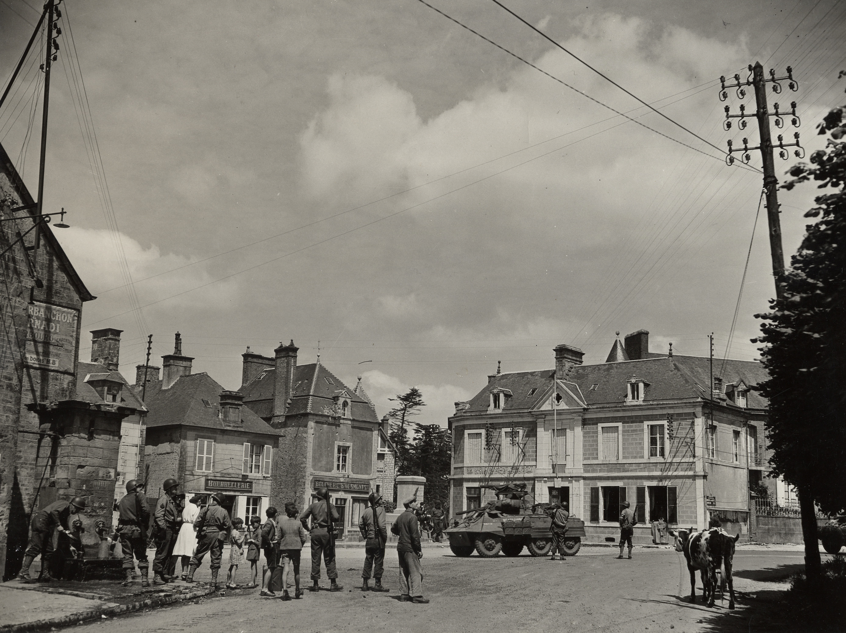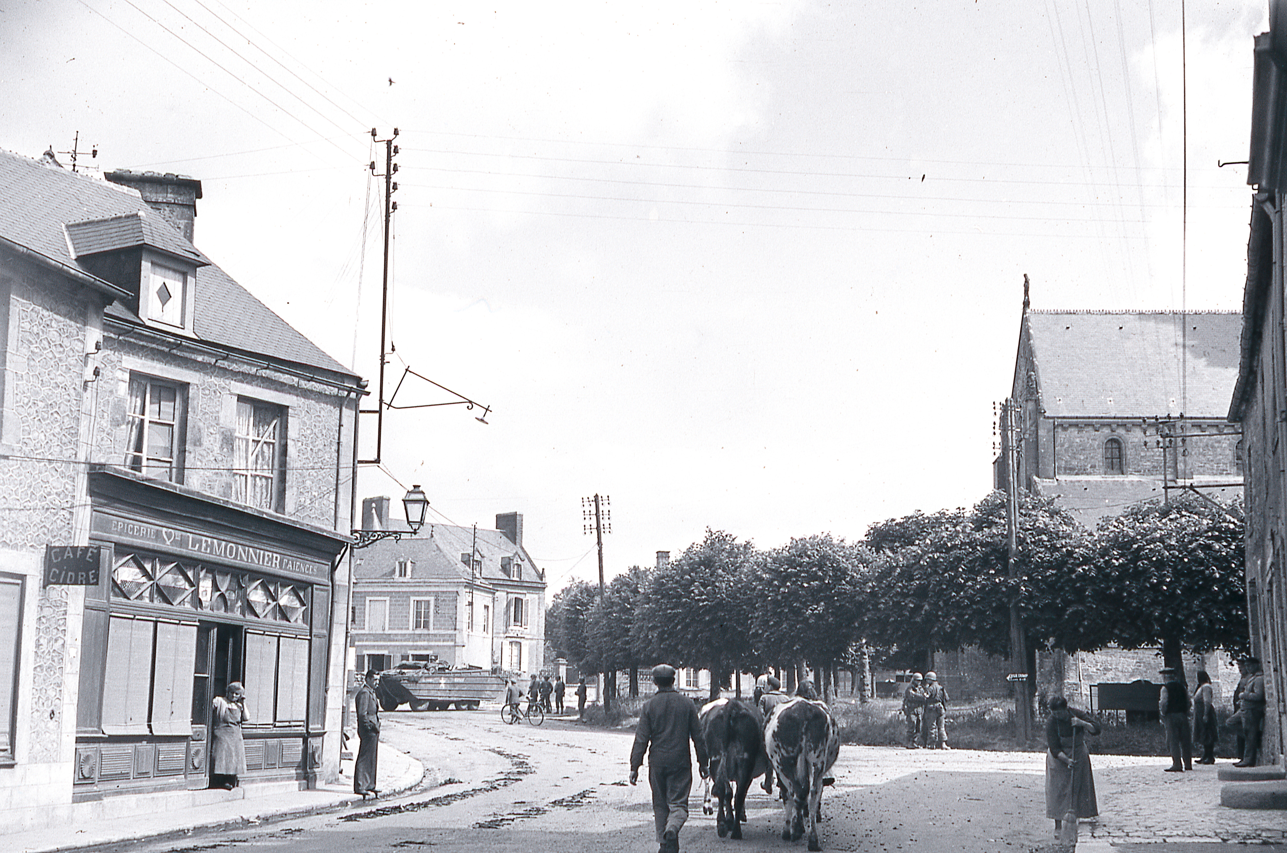 In the sunny summer of 1944, the inhabitants of Sainte-Marie-du-Mont watch with curiosity as American troops arrive in droves. While the war left visible traces in the village, such as bullet holes, life gradually returned to normal. Civilians are astonished to discover the modernity of the vehicles and the language of the liberating soldiers. On June 10, a column of the 9ᵉ infantry division passes through the village on its way to the front, with the strategic aim of isolating Cherbourg.